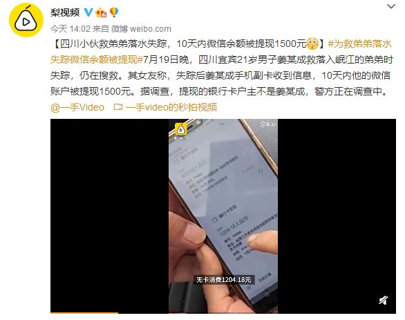 宜宾小伙为救弟弟落水失踪后,微信余额竟被人提现,家属报警!