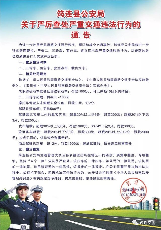 筠连县公安局关于严厉查处严重交通违法行为的通告